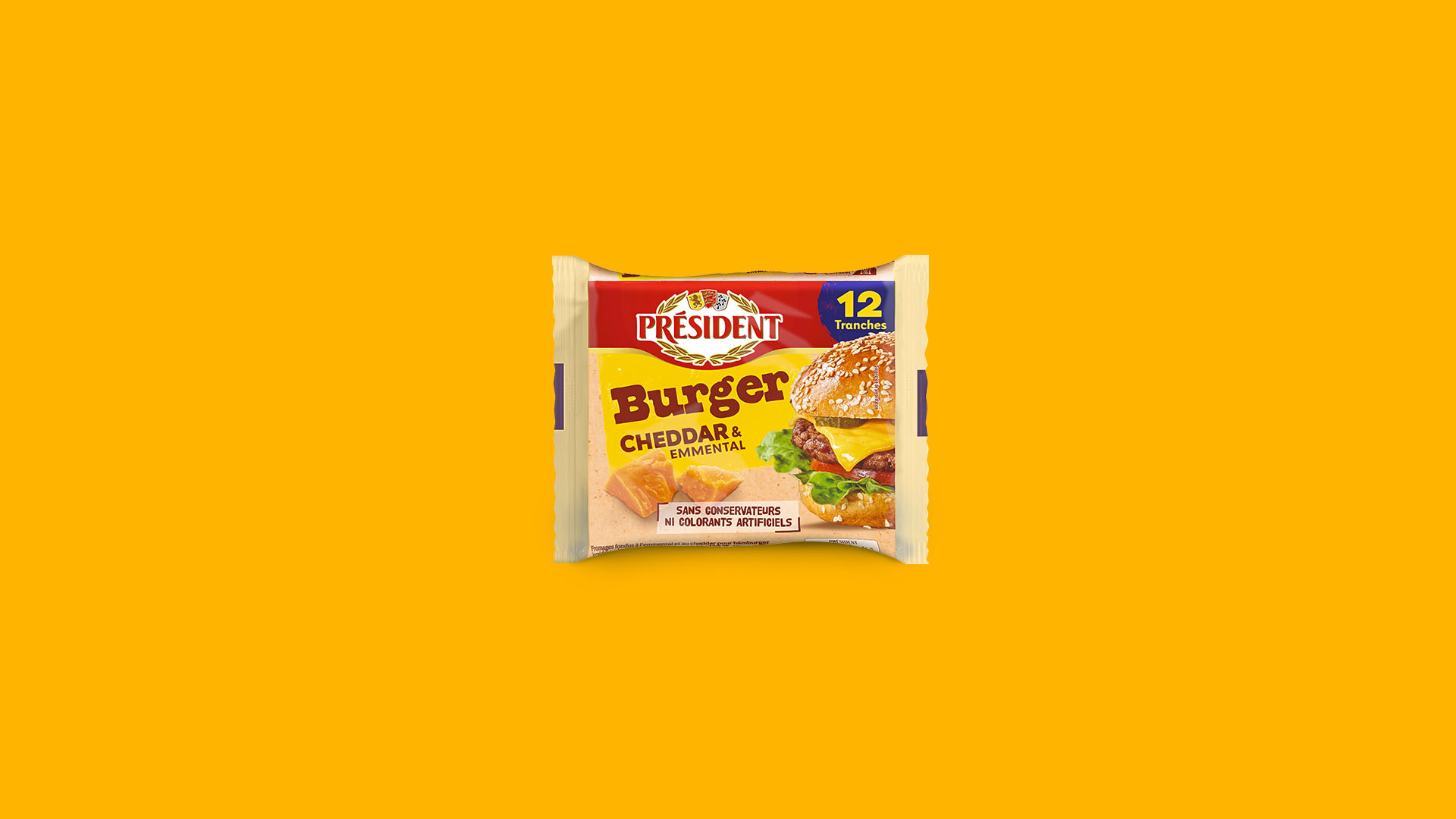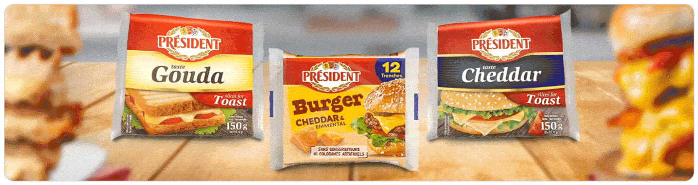 President offers three sliced cheese varieties: Gouda, Burger and Cheddar